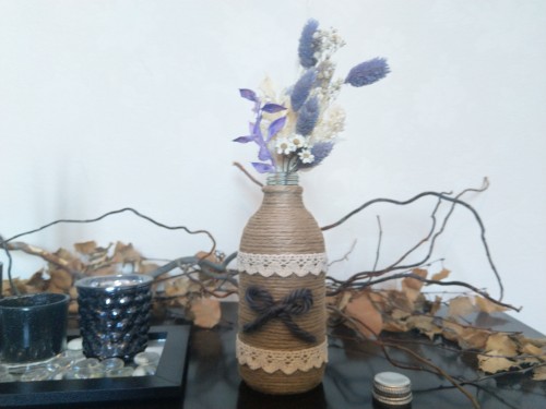 Réalisé avec une bouteille en verre et son bouchon en aluminium (récup), corde de jute naturelle, ruban beige de dentelle brodée et noeud en laine grise toute douce.